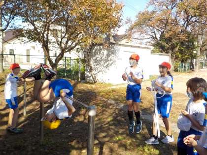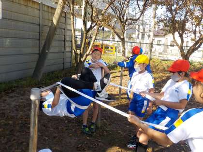 今日の体育の時間、補助紐を使って、逆上がりの練習をしました。そのおかげで何人か逆上がりが出来るようになりました。補助をしていた友達から思わず拍手も出て、うれしそうでした。