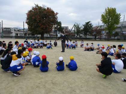 今週から、金曜日の朝に6年生と合同で体力作り運動に取り組むことになりました。今日は、6年生とこおりおにをしました。10分ほどの短い時間でしたが、思いっきり走り回ってくたくたになっていました。6年生全員がおにで、1年生が逃げる展開となったときは、さすが6年生!あっという間にみんな捕まってしまいました。あと5年後には、1年生のみなさんもあんなに逞しい6年生になっているのかな。