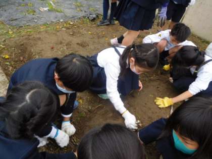 畑がみるみるうちにきれいになっていく様子です。みんな支柱をとって片付けて、苗も伸びているものは、折って小さくし袋が破けないようにていねいに片付けていました。雑草も力一杯引っ張って一生懸命頑張ってとっていました。