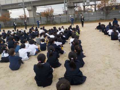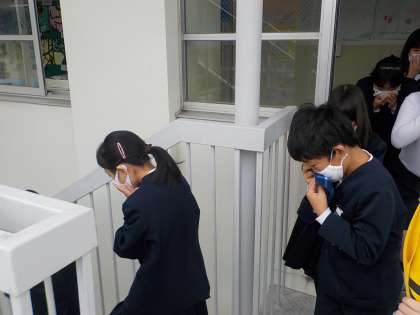 今日の避難訓練は、中分署の署員の方に来ていただき、防災訪問として実施しました。休み時間に給食室から出火したという想定で、グラウンドに避難しました。
