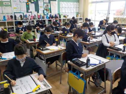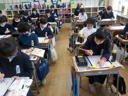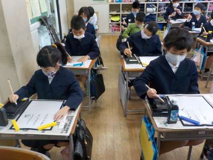 今日の書写の時間は、小筆の使い方について学習しました。姿勢、筆の持ち方、筆先の使い方等について学び、円やジグザグ線を書いてみた後、実際に自分の名前を書いてみました。最初は、太さや形がなかなか思うようにいかなかったのですが、何度も書いているうちにだんだん上手くなってきました。家でも練習したいという声も聞かれました。