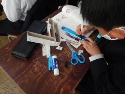 今、国語では、「馬のおもちゃのつくりかた」を学習しています。教科書をみんなで読みながら、馬の体や足をはさみやホッチキスを使って、体の部分を作ることができました。明日は、顔や馬が立つための色画用紙をつけ、完成させていきたいと思います。