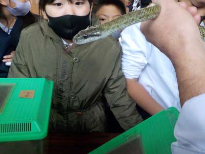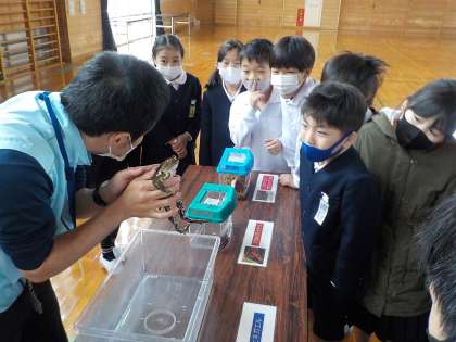 今日は、ファミリーパークから3名の方が来校され、悠久の森出前授業を行いました。呉羽丘陵に住む、ムササビやモモンガ、ホクリクサンショウウオといった貴重な生き物の話をお聞きしました。その後、実際にアオダイショウやヒキガエル、ホクリクサンショウウオを見せていただきました。ヒキガエルの鳴き声や、アオダイショウの動き、ホクリクサンショウウオの習性を初めて見た子供も多く、驚きの表情でした。