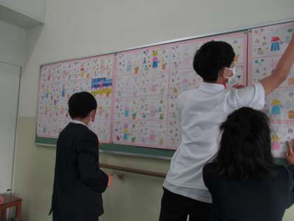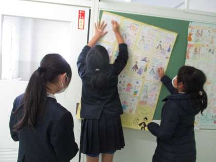 委員会で全校に募集したぬり絵大会の用紙を壁に掲示しました。テーマは「秋」です。どのぬり絵も丁寧に塗られています。