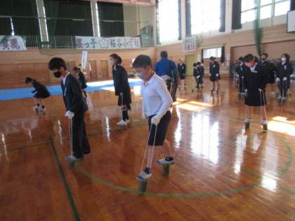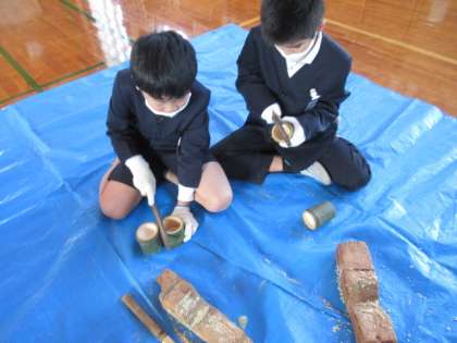 自分の作りたい高さに合わせて竹を切ったあと、竹をみがいてひもを通します。できあがった竹ぽっくりで、友達と歩いてみました。自然素材に親しみながら、すてきなおもちゃができました。