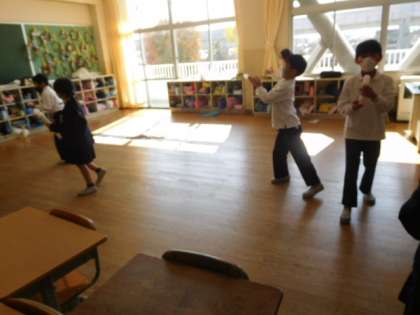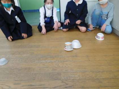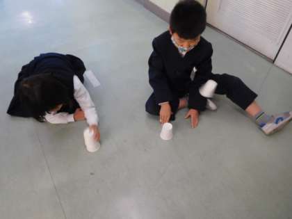 生活科では、今、おもちゃ作りをしています。みんな身近にあるものをもってきて、さまざまなおもちゃを作りました。「動いた!」や「とんだ!」などの言葉も飛び交いながら楽しく作っています。