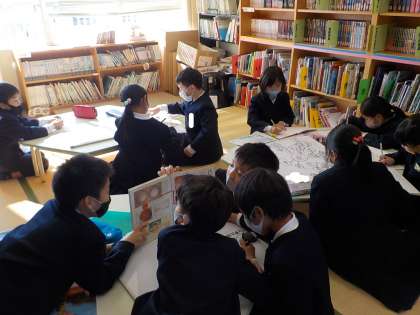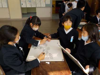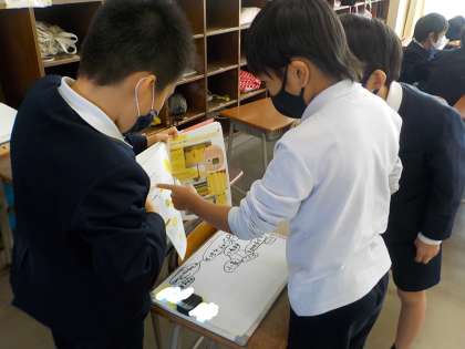 国語科では、「すがたをかえる大豆」という説明文で学んだ、「例をあげて説明する」「接続語を用いて、内容のまとまりで段落を作ったり段落相互の関係を考えて、文章を構成する」ことを生かして、「食べ物のひみつ教えます。すがたをかえる○○」と題して、文章に表現する学習に取り組んでいます。今日は、同じテーマを選んだ友達と情報交換をしました。米や肉、魚、小麦等がどのように姿を変えるのか、自分が知っていることや調べたことを持ち寄り、ホワイトボードに表してみました。自分が思いつかなかった変わり方に、「なるほど」「ほんとだ。これも変身しているんだ」など、楽しそうに活動に取り組んでいました。