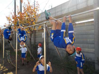 今日は、朝から穏やかな天気となりました。晩秋の陽光を浴びて、3年生の子供たちは、鉄棒運動にチャレンジしました。逆上がりが出来るようになった子が、アドバイスをしたり、励ましたりと、ほほえましい光景が見られました。今日も、「初めて逆上がりが出来るようになったよ」と、自慢げに日記に書いている子がいました。冬に向かって、今日のように晴れた日は、外で元気に運動してほしいものだと思います。