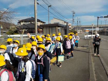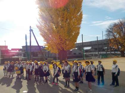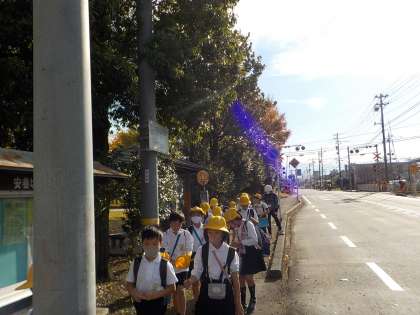 晩秋ながら、気温が25度を上回る好天に恵まれた今日、3年生は、徒歩で校外学習に出かけました。目的は、富山市民俗民芸村の見学と、呉羽山を通っての校区探検でした。朝の日差しを浴びながら、元気に出発しました。