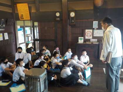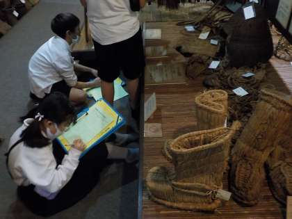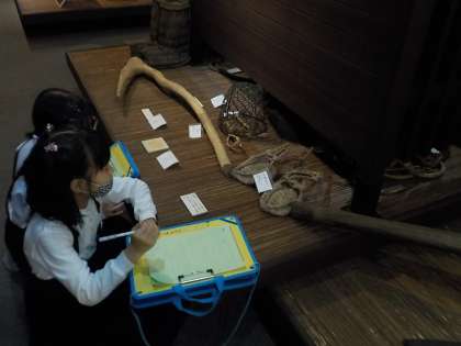 民俗資料館での5〜8班の見学の様子です。2階に展示してある、農作業の道具や、山仕事の道具、わらで作られた道具等、初めて見る道具に目が輝いていました。