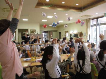 「桜谷の里」のグループは、高齢者が元気に楽しく過ごせるようなお仕事を学びました。手すり付きのお風呂を見学したり、みんなで体操をしたりするなど、いろんな体験をして大喜びの子供たちでした。