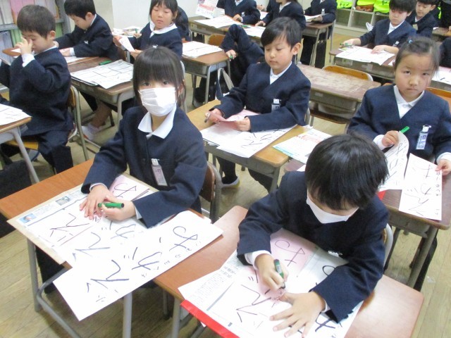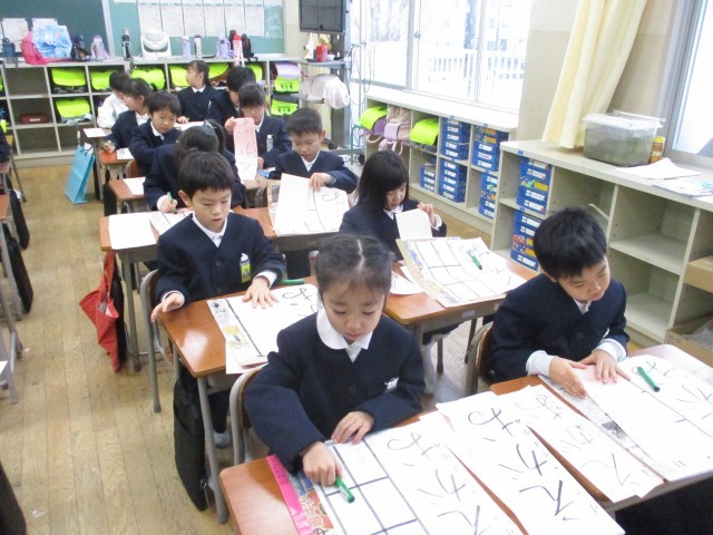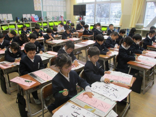 3学期はじめの始業式。静かに体育館に入る姿が立派でした。初めての書き初め大会は、「冬休みにがんばってきたよ」と自信に満ちた表情で「えがお」の文字を真剣に書いていました。休み前に比べて、力強く、整った字を書いている子供たちの姿を見て、3学期もがんばりたいという意欲を感じました。