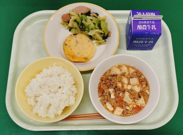今日の給食は、ごはん、牛乳、かにたま、チンゲンサイソテー、マーボー豆腐 です。