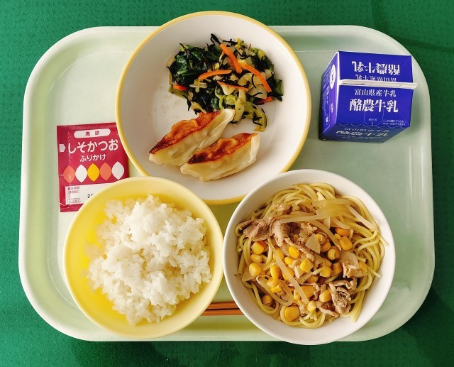 ごはん、牛乳、焼きぎょうざ、鉄たっぷりサラダ、サッポロラーメン、しそかつおふりかけ です。