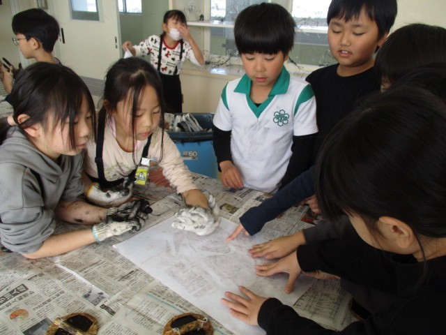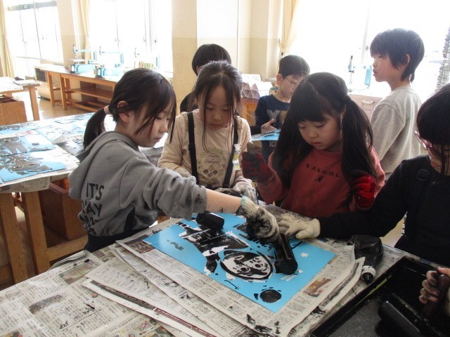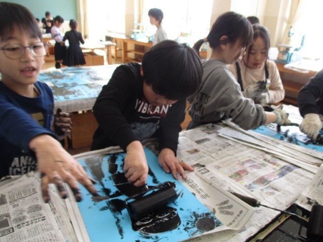 みんなで紙版画に挑戦しました。型紙に、ローラーでインクをつけて用紙にペタっと貼り付け、バレンで優しく刷りました。みんなの協力する姿が輝いていました。