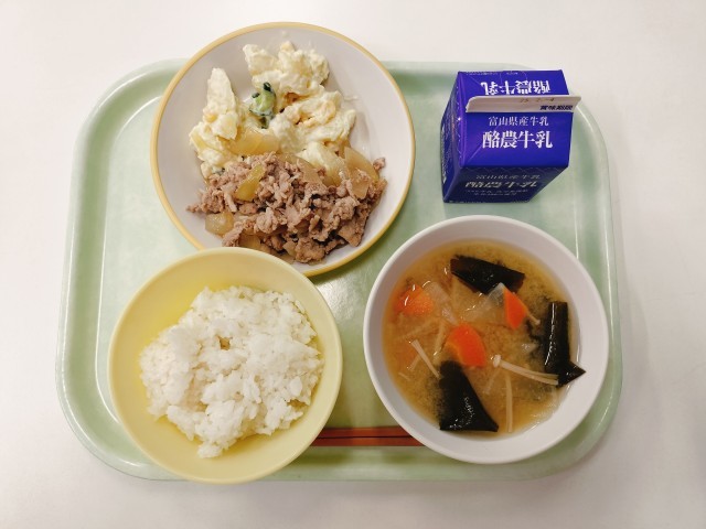 今日の給食は、ごはん、牛乳、豚肉の生姜焼き、ポテトサラダ、みそ汁 です。
