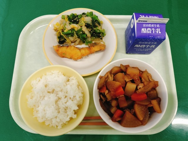 今日の給食は、ご飯、牛乳、魚(ホキ)の天ぷら、青菜のごま和え、煮みそ です。