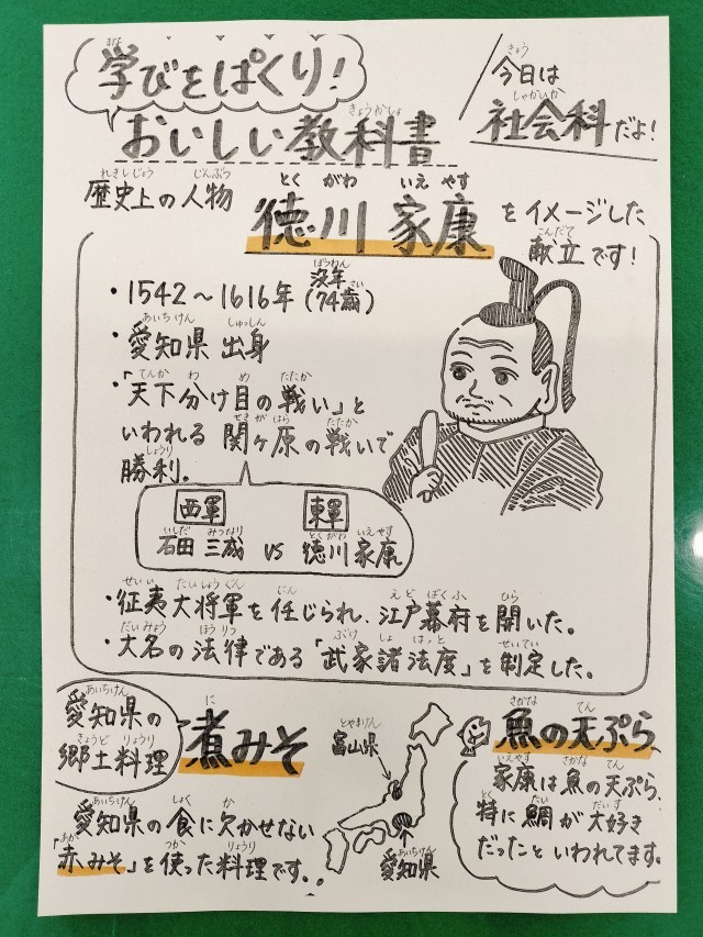 「学びをぱくり!おいしい教科書」、今日は社会科、戦国三大武将の一人「徳川家康」をイメージした献立です。