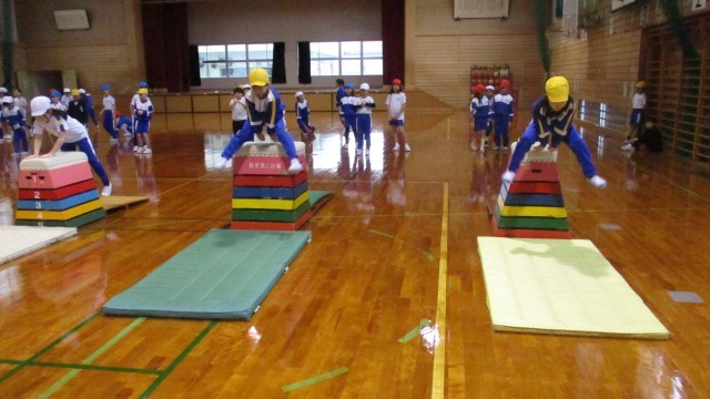 体育科の跳び箱遊びでは、自分の目的に合った練習コースを選んで練習に取り組んでいます。準備や片付けも自分たちで行い、素早くできるようになってきました。