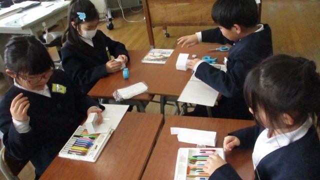 算数科での箱の面や辺の学習を生かして、自分だけの箱づくりをしています。面を6つバラバラにかいたり、面4つつなげて底とふたを貼るなど、それぞれが考えて制作していました。自分が入れたいものを入れる箱づくりに意欲的に取り組んでいます。