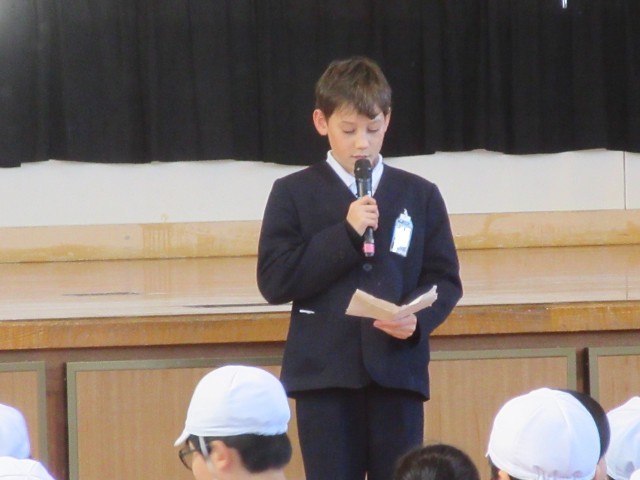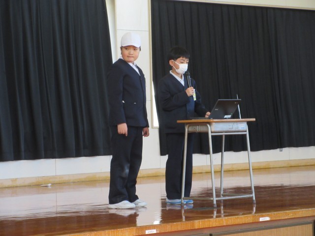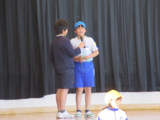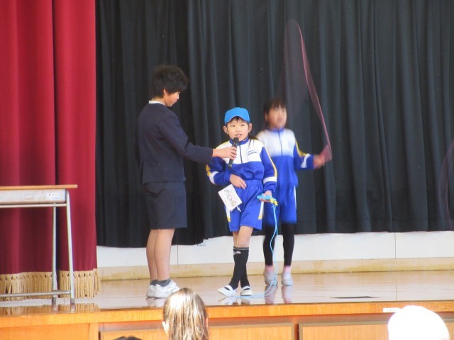 運動委員会の「短縄達人紹介」では、各学年で基準を満たした「達人」たちが、得意な技を披露し、跳び方のコツも教えてくれました。