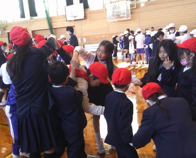 集会では、運動委員会による「短縄達人紹介」や思い出クイズ、思い出爆弾ゲーム、人間知恵の輪をしました。