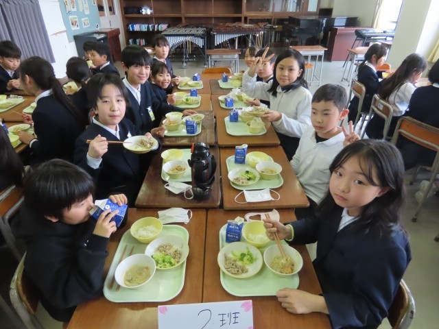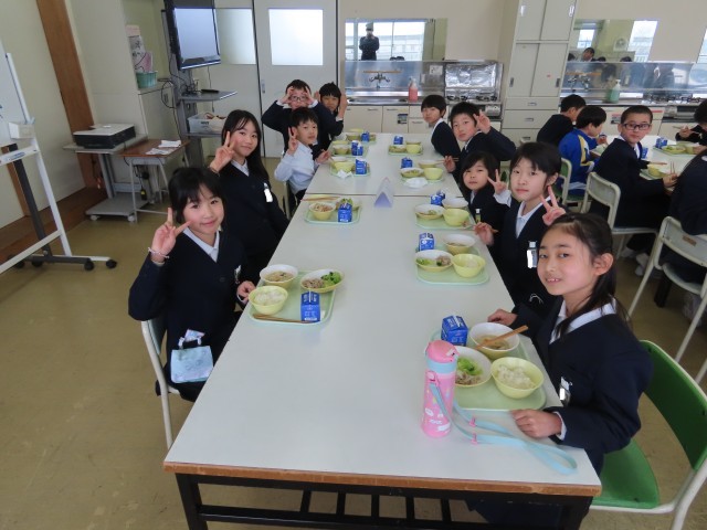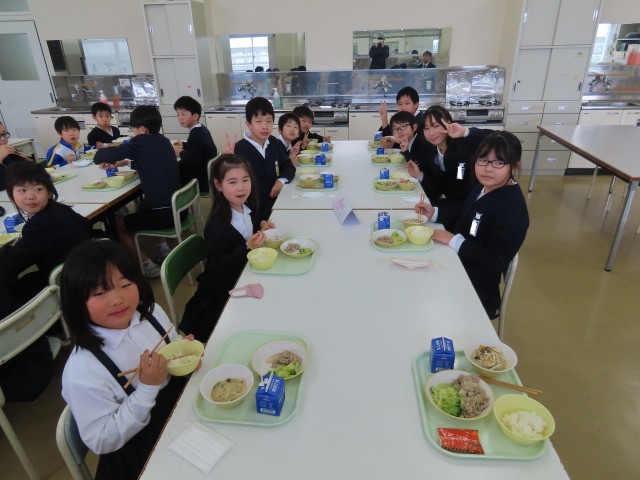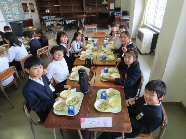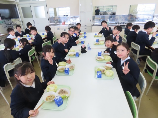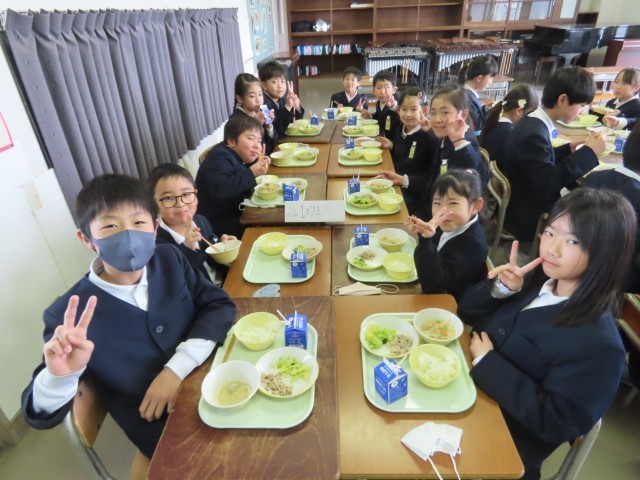卒業を祝う週間3日目の今日は、2年生と6年生のふれあいタイム(けいどろ)や青団のなかよし会食、お祝い放送がありました。