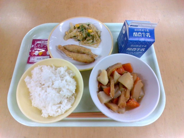 ご飯、牛乳、わかさぎのフリッター、水菜のサラダ、関東炊き、しそかつおふりかけ