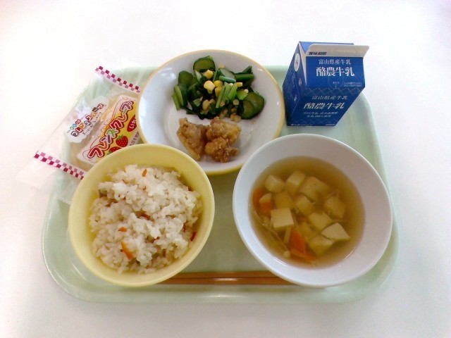 ちらし寿司、牛乳、鶏肉の唐揚げ、コーン和え、すまし汁、お祝いデザート