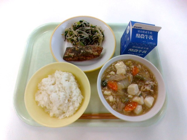 ご飯、牛乳、ふくらぎの竜田揚げ、磯和え、豆腐と野菜のうま煮