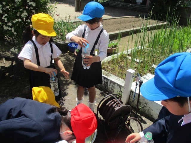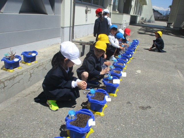 昼休みには、あさがおの植木鉢に水やりをしました。