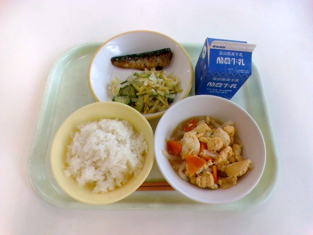 ご飯、牛乳、いわしの生姜味、あわせ和え、豆腐の錦とじ