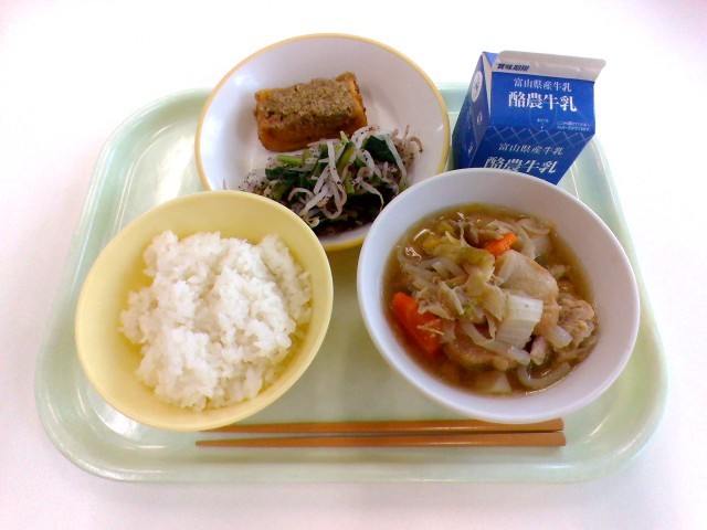 ご飯、牛乳、揚げだし豆腐のごまだれかけ、ゆかり和え、すき焼き