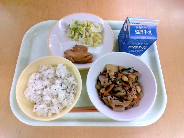 菜飯、牛乳、鶏肉の照り焼き、そえ野菜、大豆の磯煮