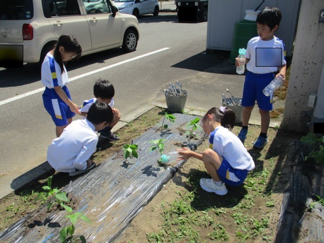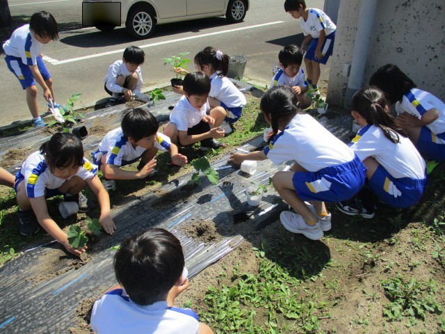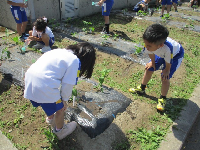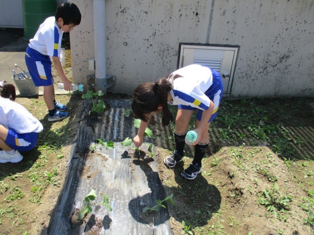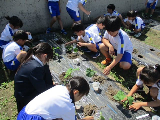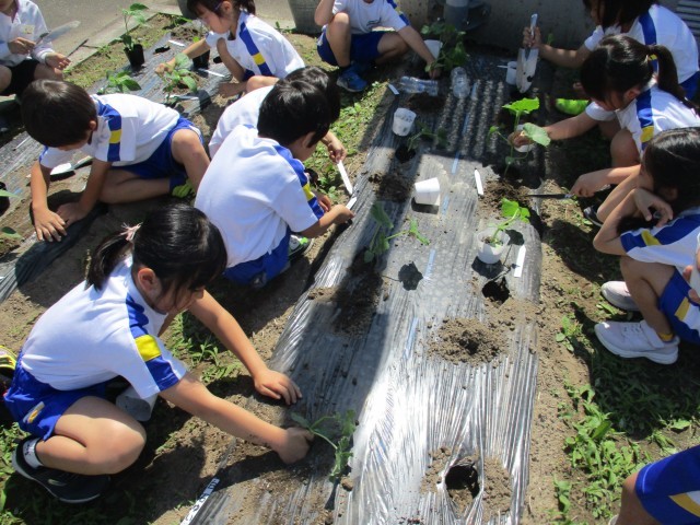 前回は2年生全員がミニトマトを植えましたが、今回はナス、キュウリ、オクラ、ピーマンの中から、自分が選んだ野菜の苗を植えました。最初に観察した際には、それぞれの葉の色やにおい、茎の手触りの違いに驚いていました。植えた後には、すぐに水やりを始めるなど、愛情をもって育てる姿が見られました。