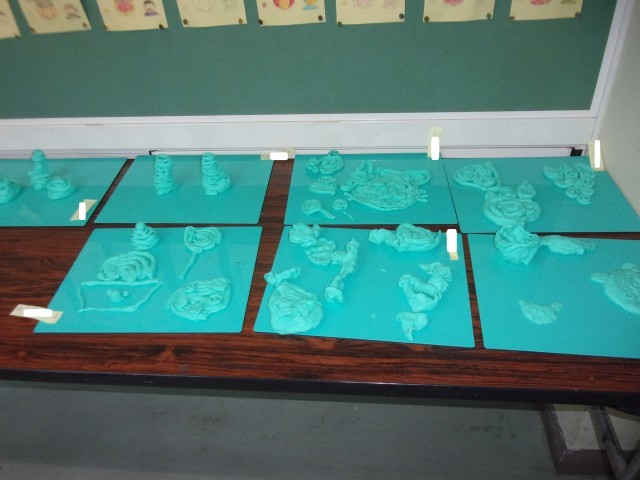 図画工作科「ひもひもねんど」の学習では、ねん土でいろいろなひもをつくって、組み合わせ、形にしました。ねん土を使った作品は、上へ上へと高くなりがちですが、子供たちは、平面状の作品に仕上げていたのが、素晴らしかったです。