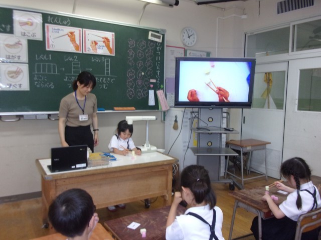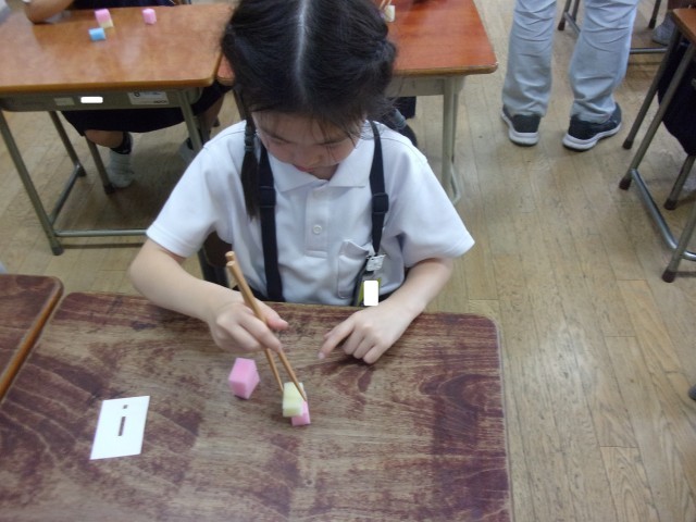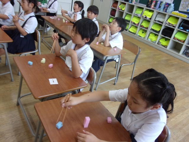 今日の学活は、栄養教諭にお箸について教えていただきました。箸の用途を考えたり、持ち方練習をしたりしました。持ち方カードやスポンジを使って、手首は動かさず、指だけで動かす練習をしました。みんな上手になったので、ぜひおうちでも見てあげてください!