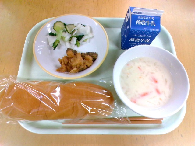 米粉コッペパン、牛乳、鶏肉とレバーのりんごソースからめ、かぶのサラダ、ビーンズポタージュ