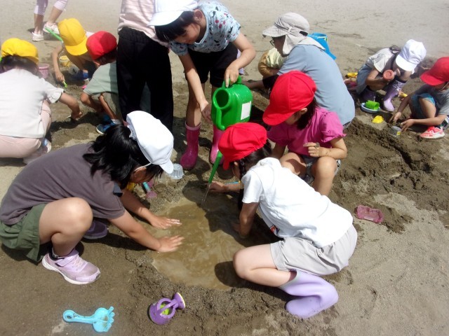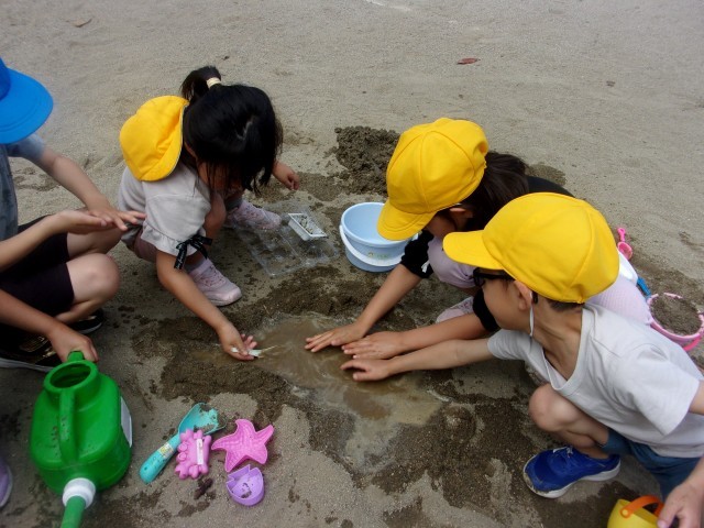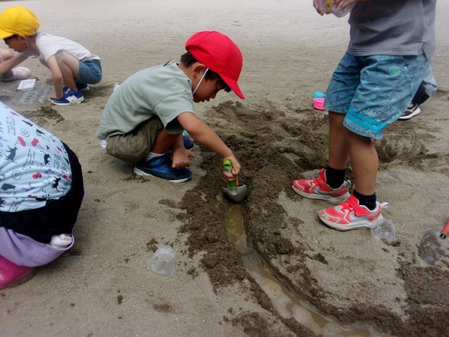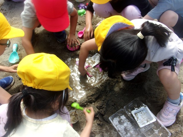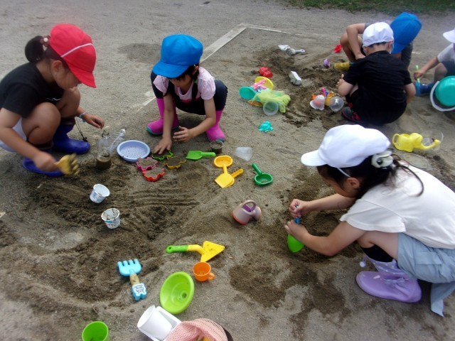 今日の図工は、外の砂を使ってダイナミックに遊びました。さらさらの乾いた砂より湿った砂の方が形になりやすい、また、川をつくって水を流すには、高低差があるとよいことなどに気づき、楽しく遊びました。