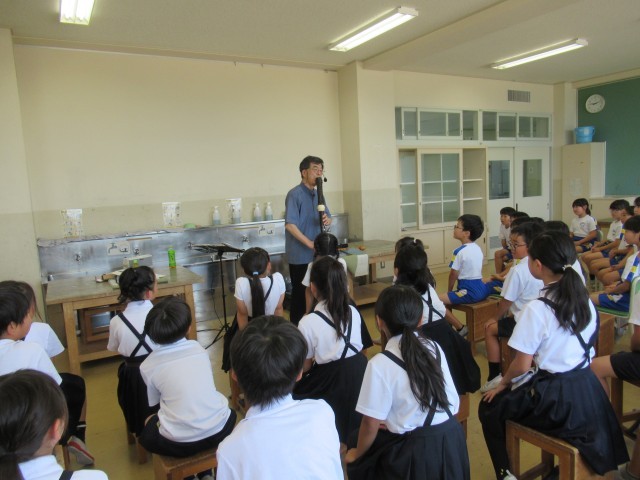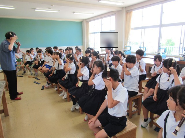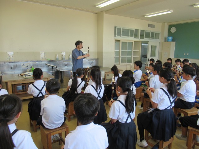 リコーダー教室があり、リコーダーの技法や音色が心を表すことを教えていただたり、様々な種類のリコーダーでの演奏を聴いたりしました。夢中になって演奏を聴いている子供たちからは、思わず「すごい」と声が漏れ、自然と拍手と笑顔が生まれていました。終わった後には、「もっと聴きたかったな」「やってみたい」と話しており、これからのリコーダーでの学習が楽しみになった様子でした。
