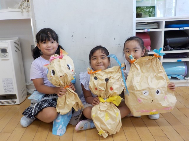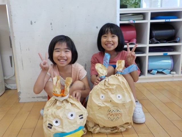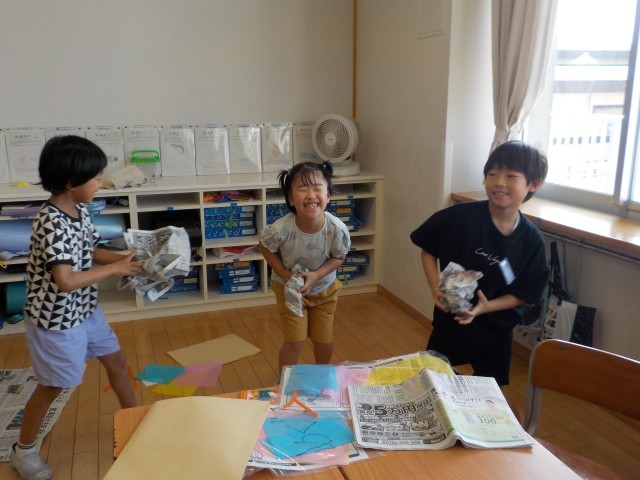 2年生の図画工作科「くしゃくしゃ ぎゅっ」の学習では、くしゃくしゃにした紙から思い付いたものを立体に表す活動に取り組みました。ひもで結んだり、飾り付けをしたりして、制作を楽しみました。