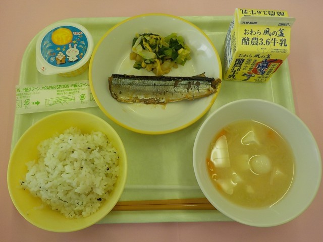 今日の献立は、菜めし、さんまのマーマレード煮、コーン和え、団子汁、お月見ゼリー、牛乳でした。