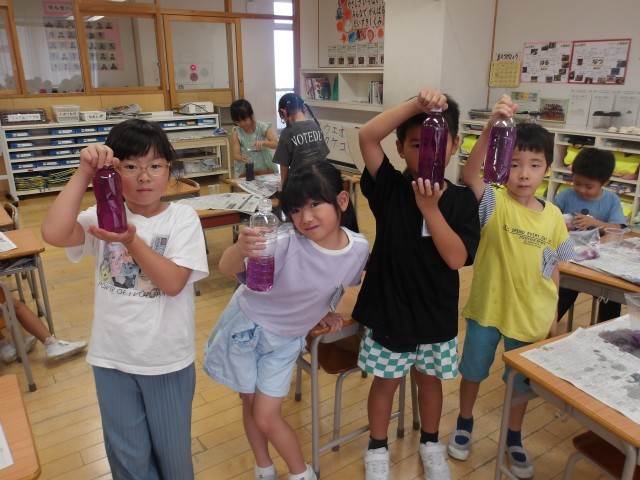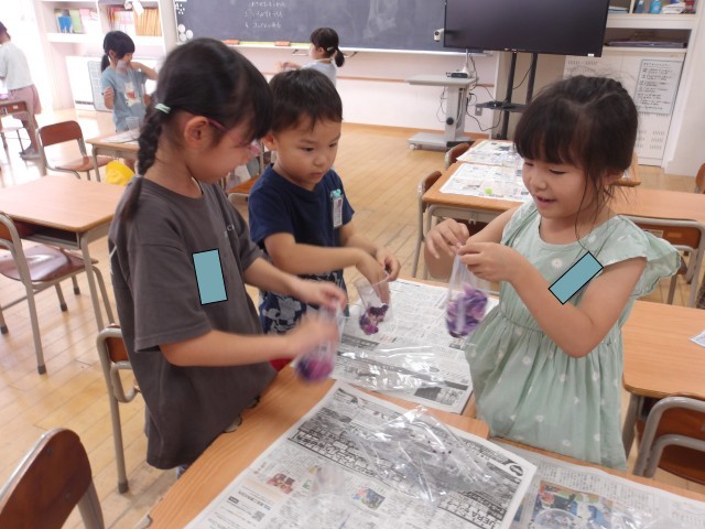 あさがおの花や水の量によって色の濃さが変わる楽しさを味わいました。