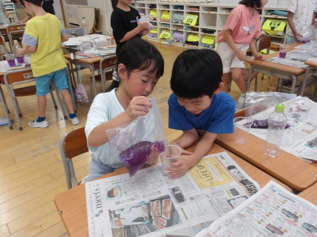 生活科で育てているあさがおを使って、色水づくりを行いました。