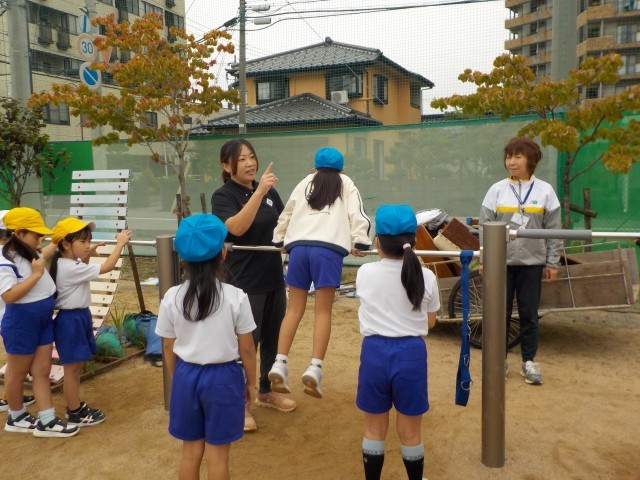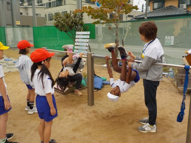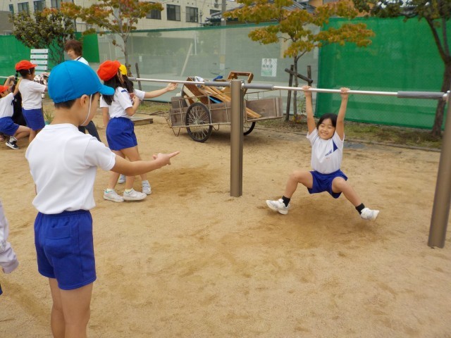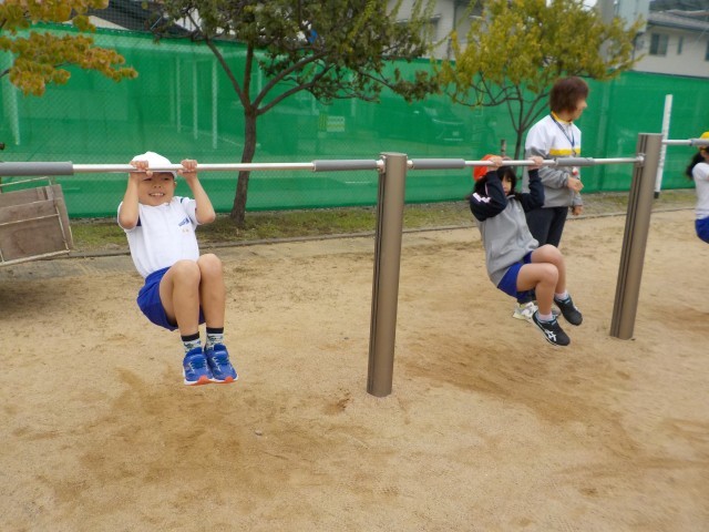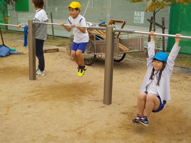 鉄棒教室では、富山市スポーツ協会の指導員の方から、ぶら下がり技や支え技等を教えていただきました。子どもたちは、肘を曲げることやお腹と鉄棒を近づけて回ること等に気を付けて様々な技に挑戦しました。