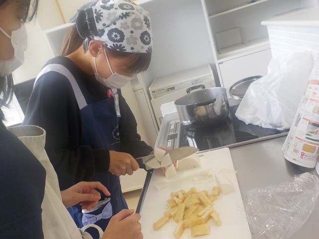 調理実習で大根と油揚げの味噌汁を作りました。煮干しの頭とはらわたを取ることや、大根の皮を包丁でむくことなどが難しかったようですが、班のみんなと協力して、楽しく調理実習できました。