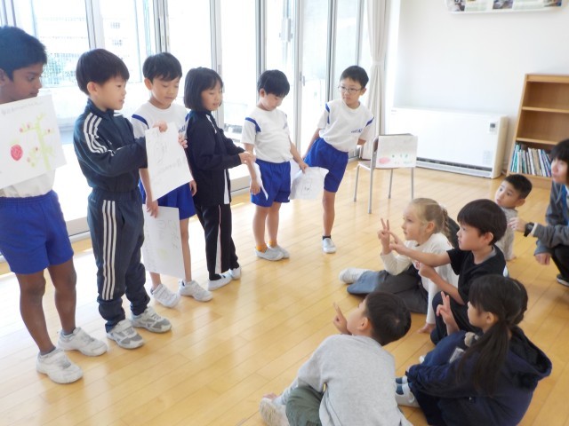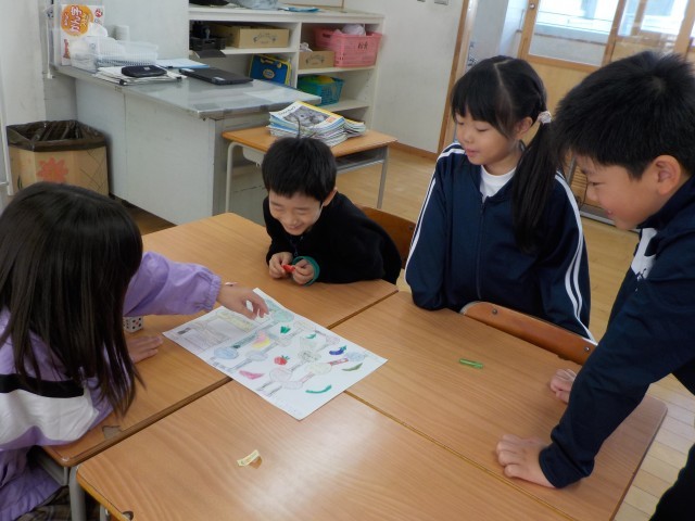 2年2組の子どもたちは、生活科で野菜を育てて、学んだことを1年生に発表しました。「1年生に野菜の育て方や成長の様子を知ってほしい」という思いをもち、かるたやすごろく、クイズなどを作成し、工夫して伝えました。
