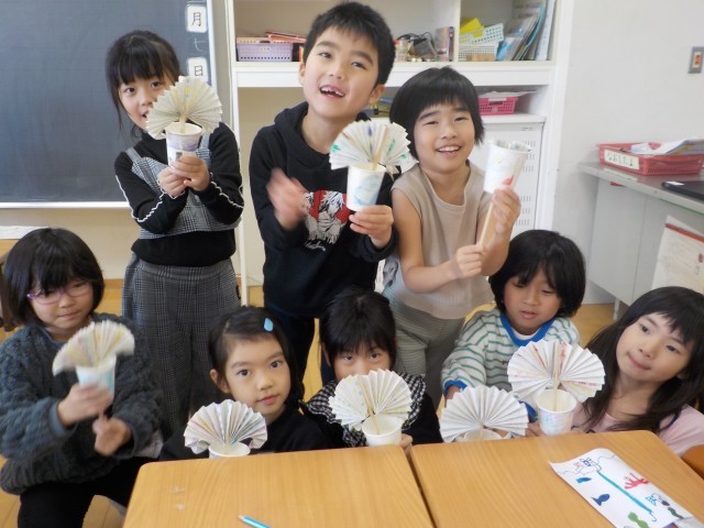 国語科「紙コップ花火の作り方」では、説明文を読んでおもちゃ作りをしました。教科書から大事な言葉や文を探したり、友達や先生に相談したりしながら作りました。出来上がると、みんなで楽しく遊ぶ姿が見られました。
