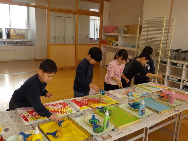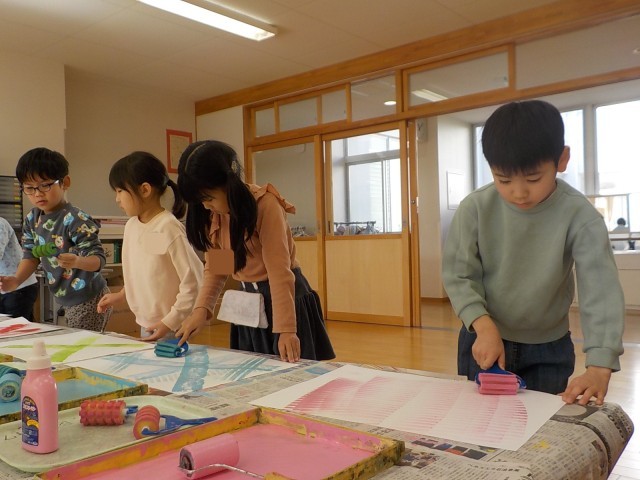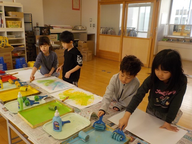 図画工作科では、ステンシルはんがをつくっています。今週は、スポンジローラーを使って、白い紙に思い思いに色をつけていきました。自分の表したいイメージに合わせて色やローラーを選んで、友達と楽しく取り組みました。