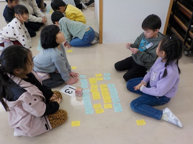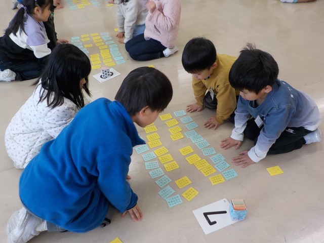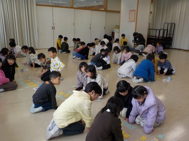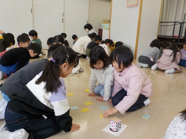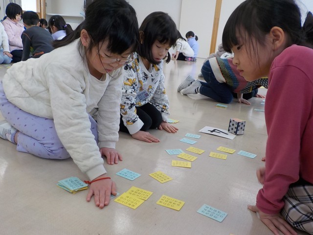 初めての百人一首の集いを行いました。これまで一生懸命覚えた、黄色と青色40枚の札をみんなで取り合いました。いつもは対戦できない、違うクラスの友達と楽しく取り組むことができました。